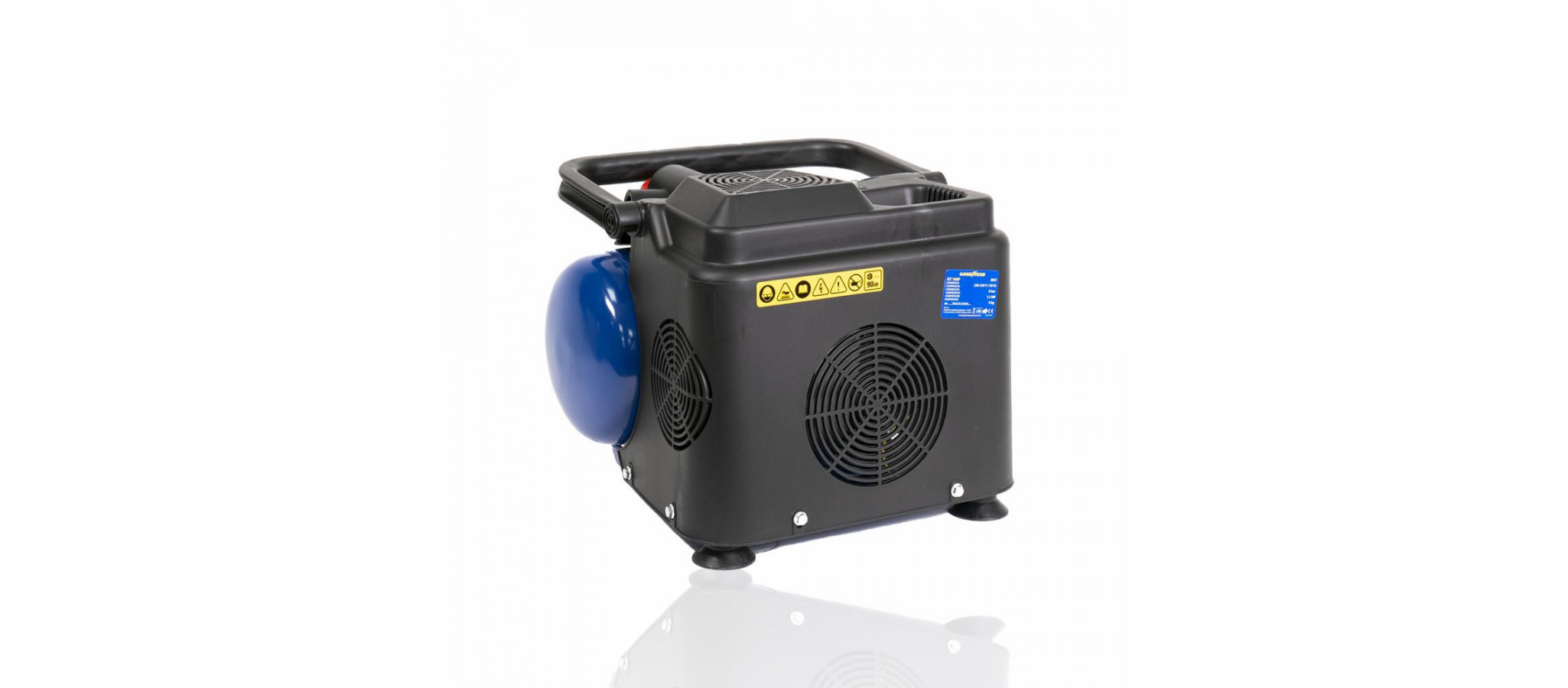 Compresor eléctrico de aire comprimido Goodyear GY166P de 1,5HP de potencia que se puede usar tanto para exteriores, interiores, para autos y como inflador de neumáticos. Tiene un tanque de capacidad de 6 litros que se llena rápidamente ¡Continúa trabajando sin largas interrupciones! Ha sido diseñado para que sea fácil de usar, de manipular y de almacenar. Pesa 10 kg y cuenta con un asa ergonómica con agarre suave para ser lo más cómoda posible de transportar. Su acoplamiento rápido a la manguera sólo requiere un clic para comenzar a funcionar. Es relativamente silenciosa: no supera los 100dB de ruido. Tiene una válvula de seguridad y tiene las certificaciones CE, EMC y GS. Tanque de 6 litros de capacidad