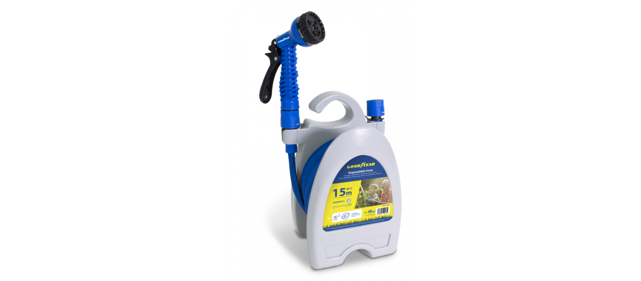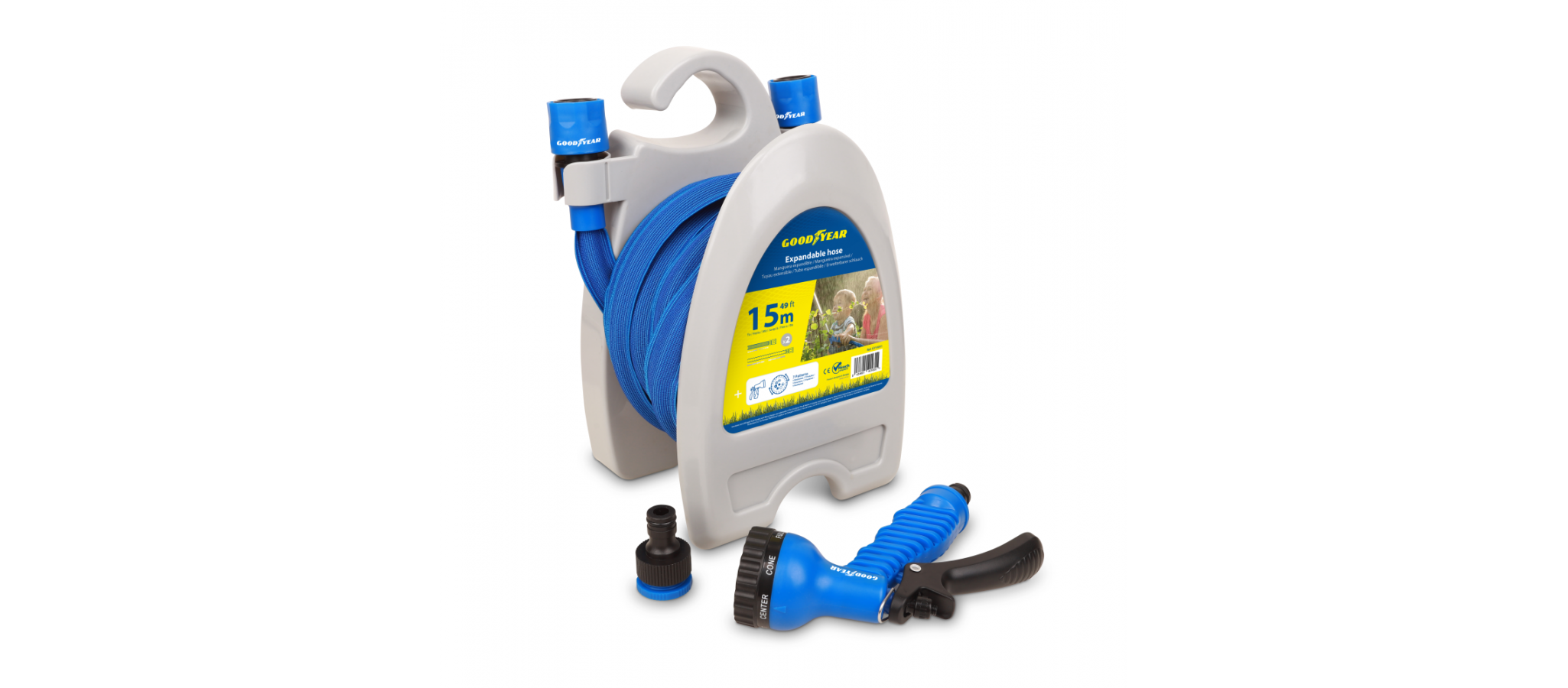 MANGUERA EXPANDIBLE GOODYEAR GY10051 6X9,5 C/ENROLLADOR PISTOLA 7 FUNC CONECTOR RAPIDO 1/2" 3/4" 15M