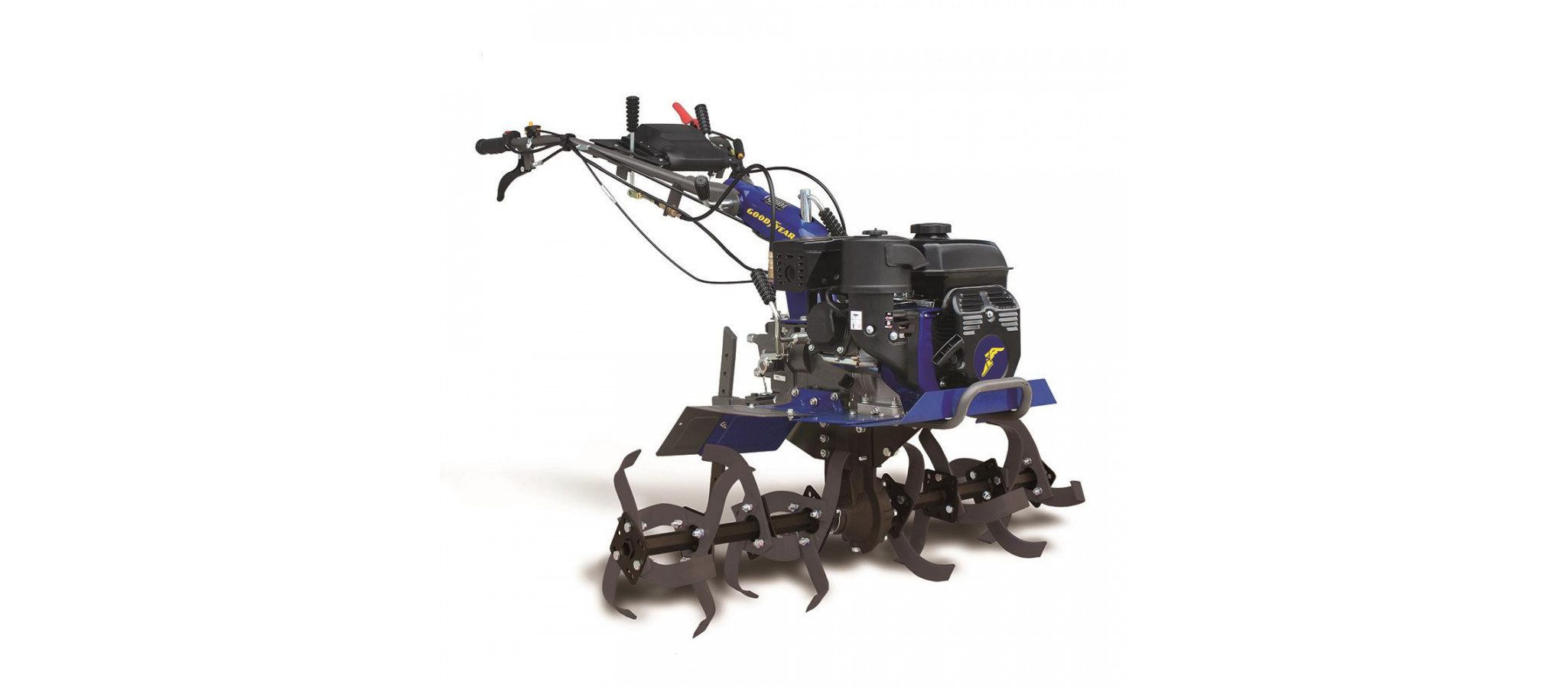 Motoazada de gasolina Goodyear de 7HP con manillar regulable en altura. Sus 32 cuchillas permiten una profundidad de trabajo excepcional e incluye diferentes accesorios para completar las labores de arado de la tierra.